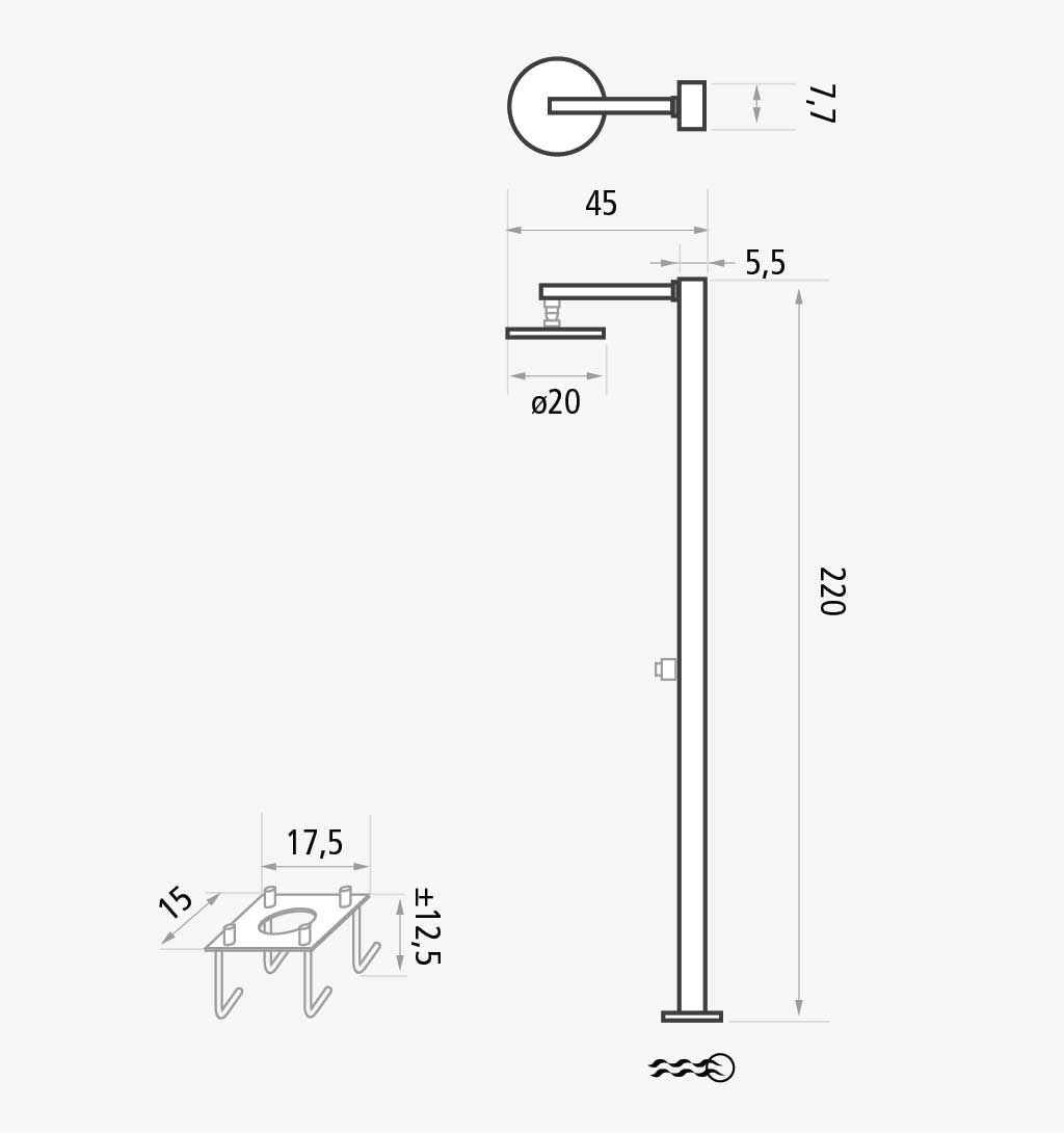Duschpelare av rostfritt stål förberedd för installation på golv i utomhusområden, terrasser, trädgårdar, offentliga och privata pooler.