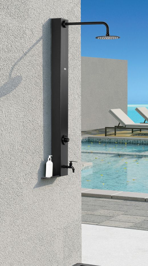 Duschpelare tillverkad av rostfritt stål, redo för väggmontering i utomhusområden, terrasser, trädgårdar, offentliga och privata simbassänger.