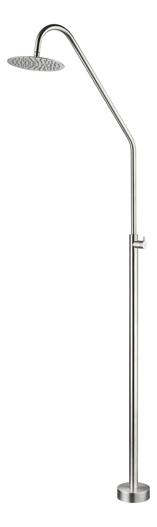 Ducha exterior Alaska en acero inoxidable S.316, ideal para jardín y piscina por su resistencia a la corrosión. Incluye rociador orientable de 25 cm con sistema antical y grifería monofluido (solo agua fría). Instalación a suelo con base de fijación robusta.