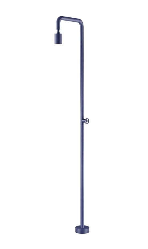 Ducha exterior Pool en acero inoxidable S.316 con acabado azul océano. Incluye rociador orientable de 80 mm con antical y columna tubular de 42 mm con giro 360°. Sistema monofluido (solo agua fría) e instalación a suelo con base estable.