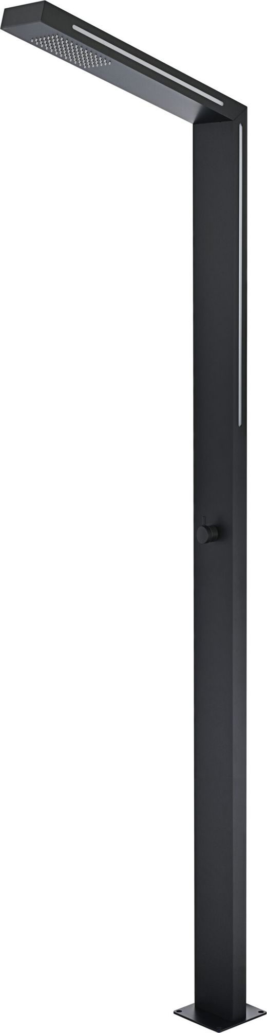 Ducha exterior Sense LED Light en acero inoxidable S.316 con acabado negro mate e iluminación LED integrada. La luz funciona con dinamo (se enciende al abrir el agua). Rociador rectangular con LED, altura 191,5 cm y grifería monofluido 1 vía (solo agua fría). Ideal para piscina.