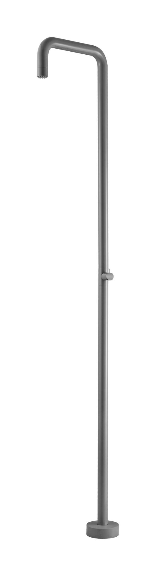 Ducha exterior Utah en acero S.316 con acabado gris cobalto, ideal para jardín y piscina por su resistencia a la corrosión. Cuerpo tubular de 50 mm y rociador tubular de 50 mm con sistema antical. Grifería monofluido de 1 vía (solo agua fría) y fijación a suelo.