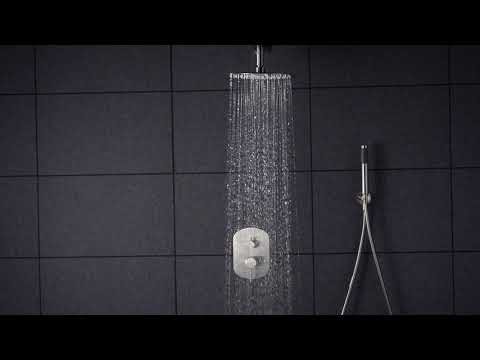 rostfritt stål infälld duschapparat, giltig för inomhus och utomhus. Rostskydds. Sammansatt av: 2-grepps förkromad mässingsfördelare, PVC-förstärkt slang, runt duschhandtag, vattenanslutning med stöd för kontroll, 25 cm rostfritt stål duschhuvud, mässingsväggarm.