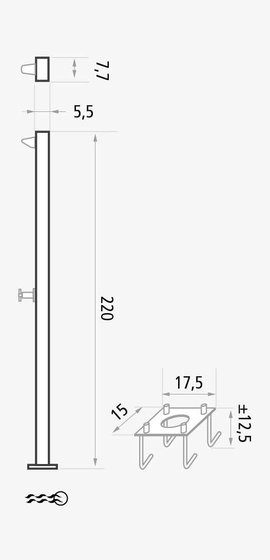 Duschpelare av rostfritt stål förberedd för installation på golv i utomhusområden, terrasser, trädgårdar, offentliga och privata pooler.