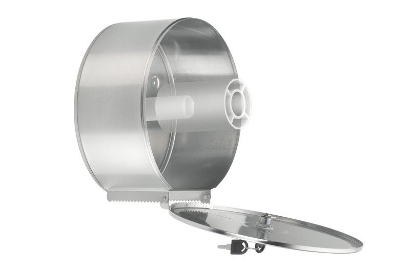 Pappersrulleutmatare färdig i borstat rostfritt stål 304. Det passar för två rullstorlekar. Inre diameter på valsen 35 och 75 mm. För väggmontering.